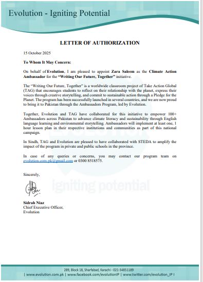 Ms. Zara Saleem, faculty member at the Center for Languages (CFL), School of Liberal Arts (SLA), has been appointed as a Climate Action Ambassador for the international initiative “Writing Our Future, Together.” This global classroom project, led by Take Action Global (TAG) and implemented in Pakistan through Evolution, aims to promote climate literacy, sustainability, and environmental storytelling through English language education.