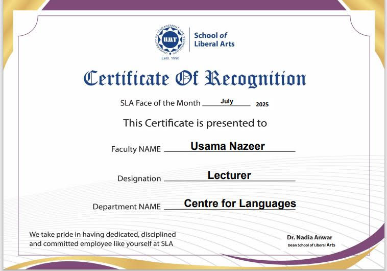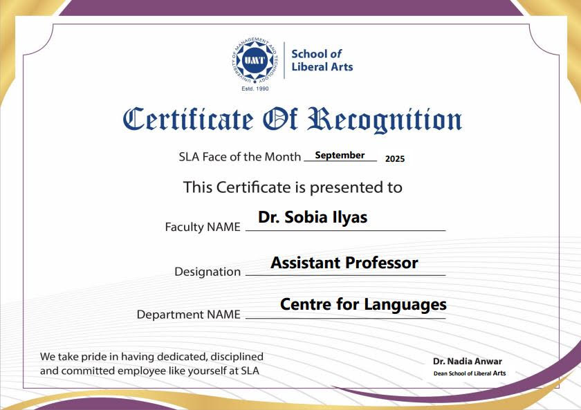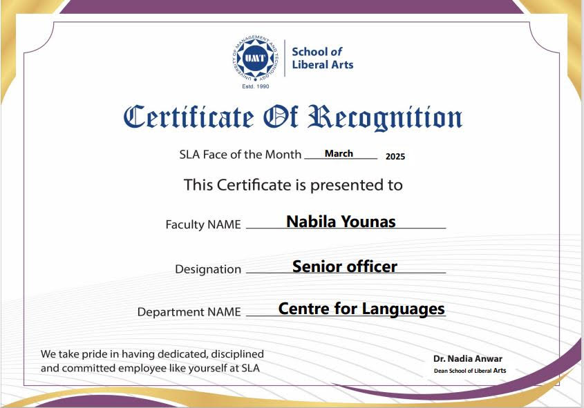 We are proud to announce that Ms. Zara Fatima from the Department of Center for Languages, School of Liberal Arts, has been awarded a Letter of Appreciation for Excellence in Teaching for the Fall 2024 semester. She received this recognition for securing above 90% in students' feedback, placing her among the top-performing faculty at UMT. Her dedication to quality education and student engagement continues to uphold the university’s commitment to academic excellence. Congratulations, Ms. Fatima!