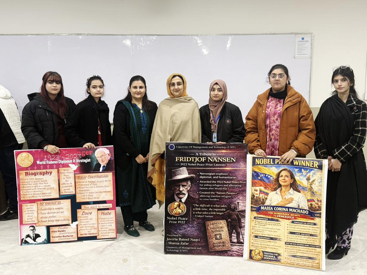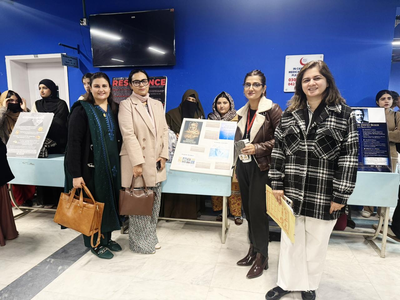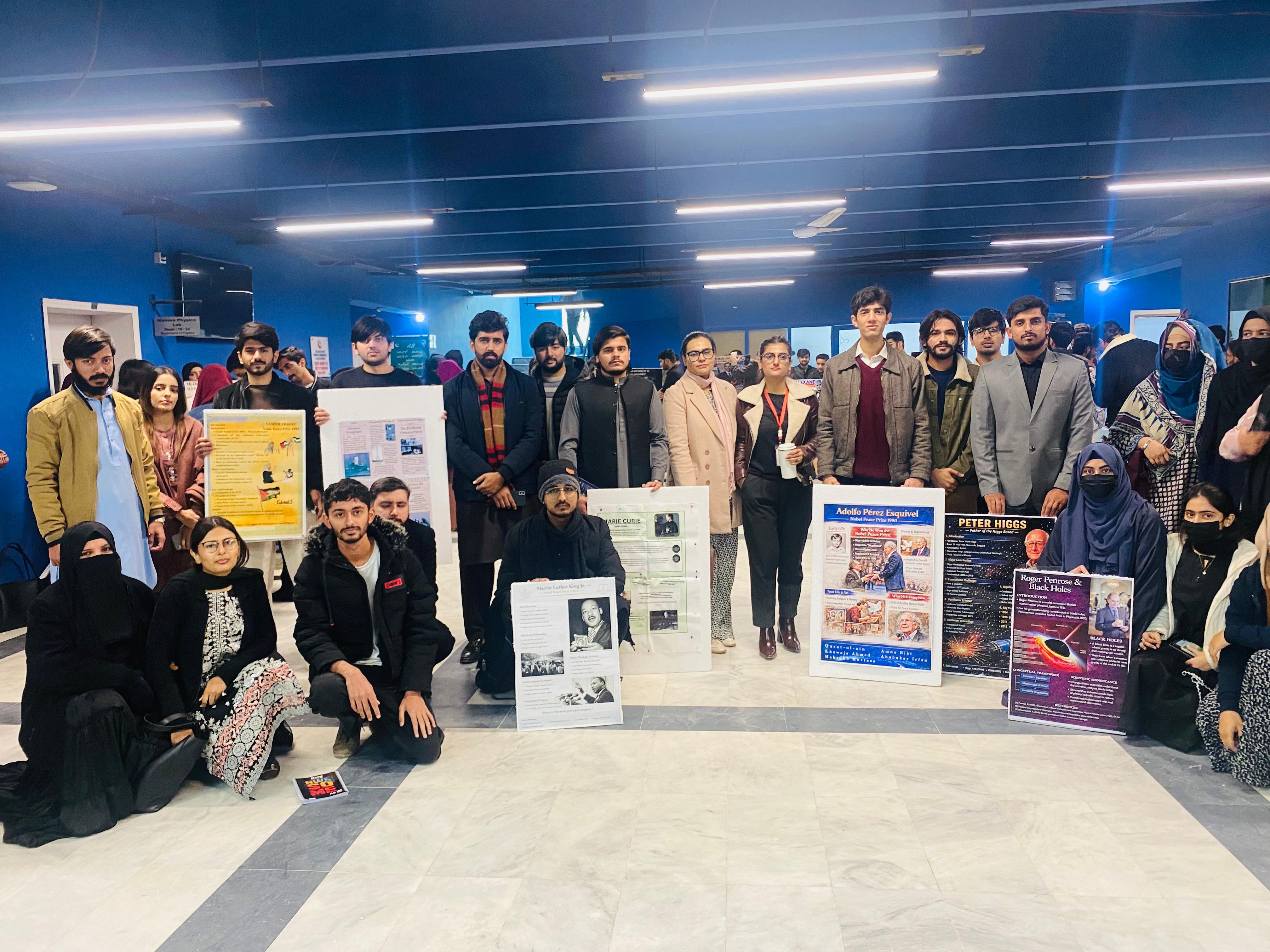 Under the URISE initiative, Ms. Naheed Ashfaq Qureshi, Ms. Sadia Noreen, and Ms. Shama Iqbal Hussain from Center for Languages, successfully organized an exhibition, “A Tribute to Nobel Laureates: Celebrating Minds That Changed the World,” held on 5 January 2026. The exhibition featured documentaries and posters examining landmark contributions of Nobel Laureates across disciplines. Students demonstrated strong research engagement, critical insight, and creative presentation, illustrating how these exceptional thinkers have shaped knowledge, society, and global discourse. The event fostered an environment of academic exchange and reflective learning among students and faculty, reflecting the Center’s continued commitment to fostering research-oriented learning, intellectual engagement, and scholarly excellence.